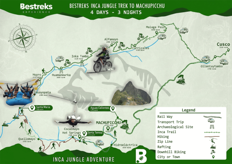 The Inca Jungle Trek crosses various ecosystems, which involves significant altitude changes along the route. Here are the main landmarks with their respective heights: